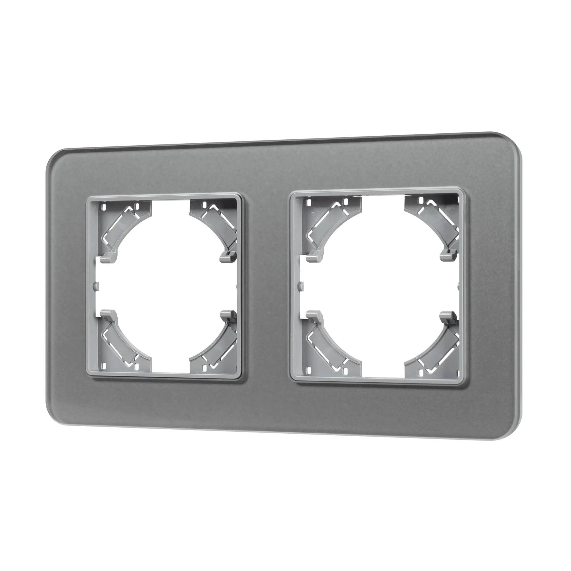 Рамка стеклянная на 2 поста, под встраиваемый механизм. Цвет - серый с Soft-Touch покрытием. Уровень герметичности IP20. Ориентация монтажа - горизонтальная (основным ориентиром служат посадочные выступы для накладки механизма).